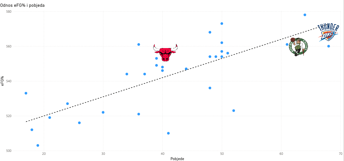 Matematika iza trica je jasna: uz slobodna bacanja i polaganja, trice su najefikasniji način za postizanje poena. To potvrđuje i graf koji prikazuje korelaciju između eFG% (effective field goal percentage) i broja pobjeda — što je eFG viši, to je omjer bolji. U tom kontekstu, šuterska revolucija ima čvrstu statističku podlogu.